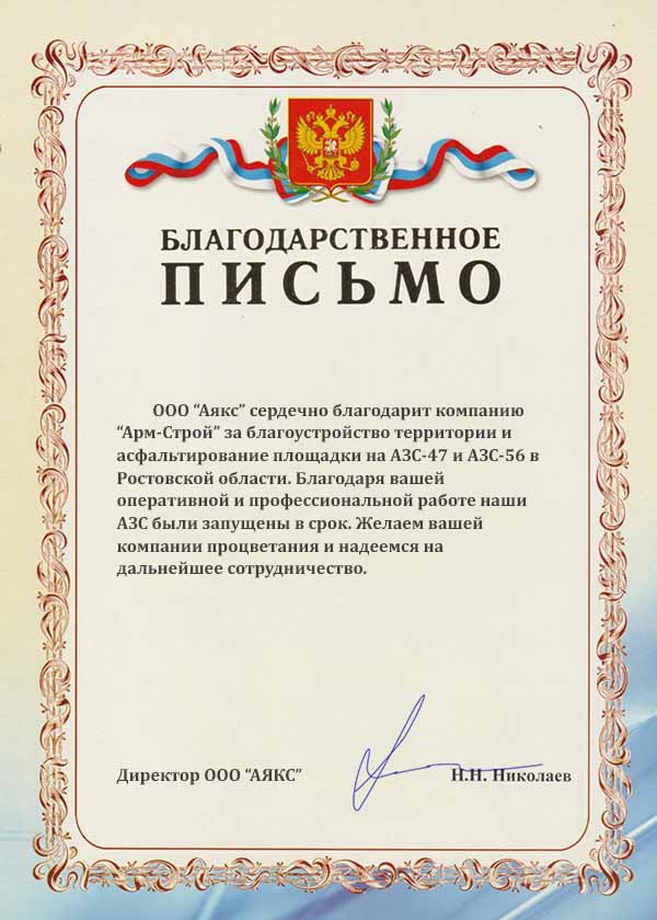 Арм-Строй поработали очень хорошо. В качестве генподрядчика при строительстве масштабного ТРЦ мы работали с несколькими подрядчиками. И я могу с уверенностью заявить, что компания Арм-Строй показала себя как лучший подрядчик по укладке асфальта, с которыми мне приходилось работать в течение последних лет. Я бы рекомендовал компанию Арм-Строй другим для исполнения любого этапа в строительства дорог или асфальтировании территорий