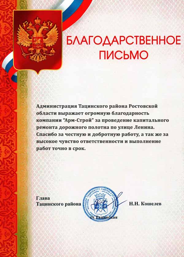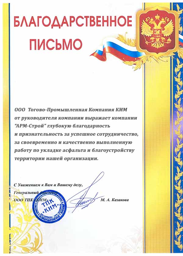 Хочу выразить благодарность коллективу «Арм-Строй». Все работы были сделаны своевременно. Я получал отчеты на каждом этапе укладки дороги. Работа выполнена качественно. Нужно было проложить асфальт во дворе нашего офиса и сделать подъезд к парковке. Выбрали сами разные материалы и технологии, объяснили, почему так лучше. Видно, что мастера точно знают, что делают.